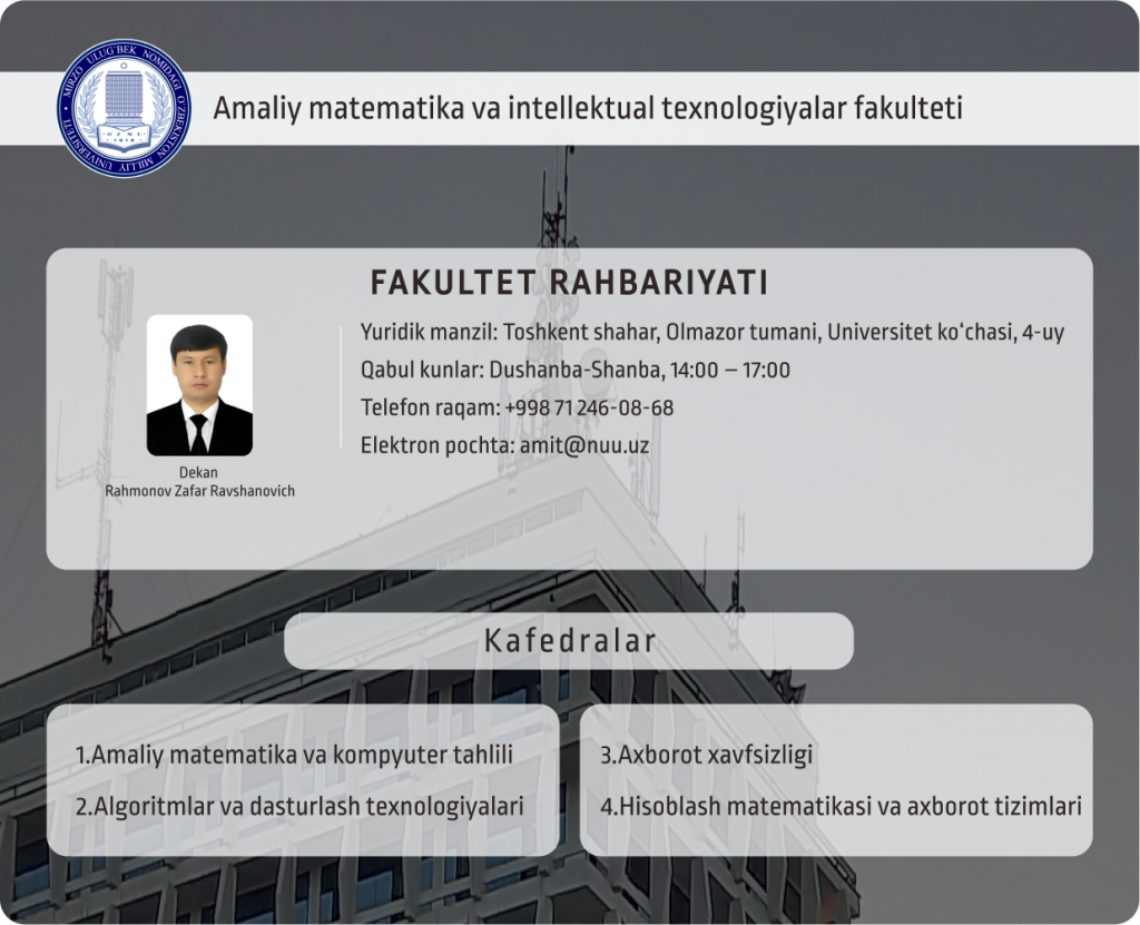 Raxmonov Zafar Ravshanovich – Fakultet dekani 100174 Toshkent shahar Olmazor tumani, Universitet ko’chasi 4-uy