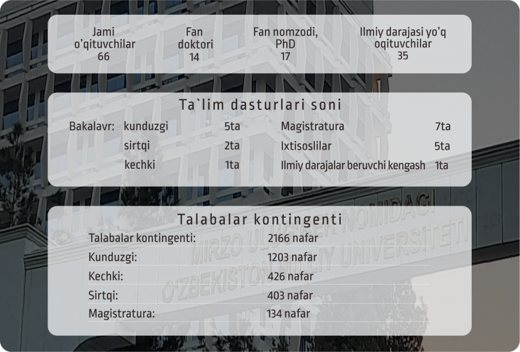 Professor-o‘qituvchilar soni umumiy 66 nafarni tashkil etadi, jumladan: