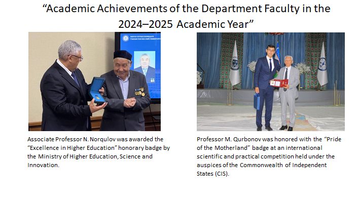 In recent years, the institute of senior research fellows has been successfully operating within the department. In particular, under the supervision of Prof. U. Abdurahmanov, 4 Candidate of Sciences dissertations were defended; under Prof. K.A. Tursunmetov – 9 Candidate of Sciences dissertations; under Prof. M. Kurbonov – 7 PhD dissertations in Pedagogical Sciences and 1 Doctor of Sciences (DSc) dissertation; under Assoc. Prof. D.A. Begmatova – 3 Candidate of Sciences dissertations.