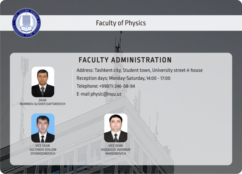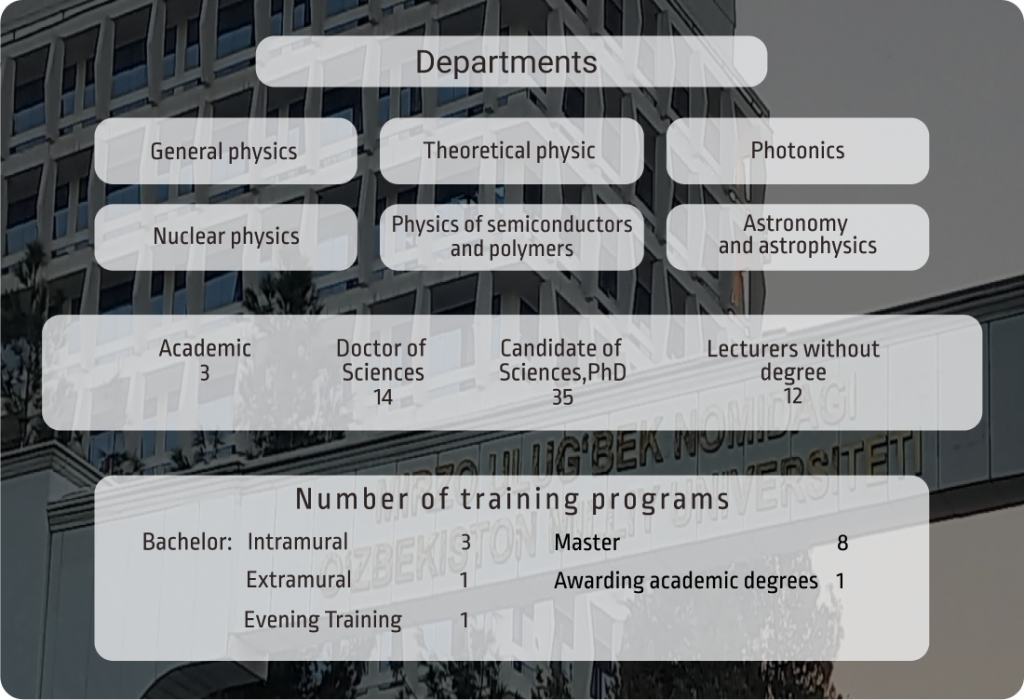 The Faculty of Physics prepares qualified bachelors and masters in Physics and Astronomy degree. Nowadays 4 member of Academy of Science Republic of Uzbekistan, 19 professors and more than 30 associate professors are involved inthe teaching process at the Faculty. Currently 425 bachelor students in 2 fields of study and 97 master students in 7 fields of study are educated on the Faculty. The Faculty of Physics also offers postgraduate and post doctorate training, where currently more than 15 postgraduate students and postdoctoraes are preparing their PhD and DSc research works.