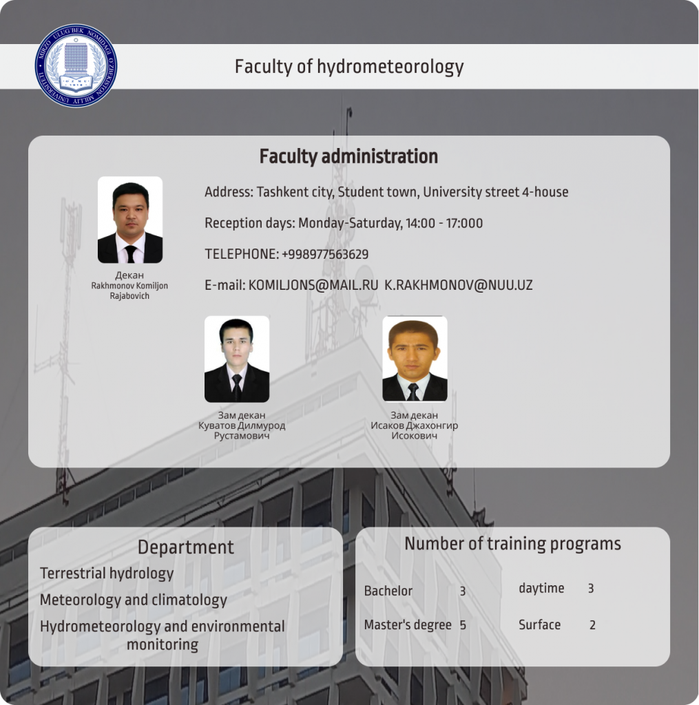Faculty of Hydrometeorology of National University of Uzbekistan named after Mirzo Ulugbek was established on the basis of the Decree of the President of the Republic of Uzbekistan PD-No. 4896 dated November 17, 2020 to improve the activities of the Hydrometeorological Service of the Republic of Uzbekistan and the order of the Rector of the National University No. 01-265 dated June 17, 2021
