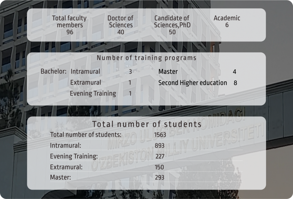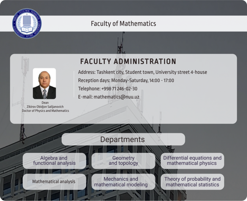 The Faculty of Mechanics and Mathematics is one of the oldest faculties of the National University of Uzbekistan, it was established as a department in the Union of the People’s University of Turkestan.