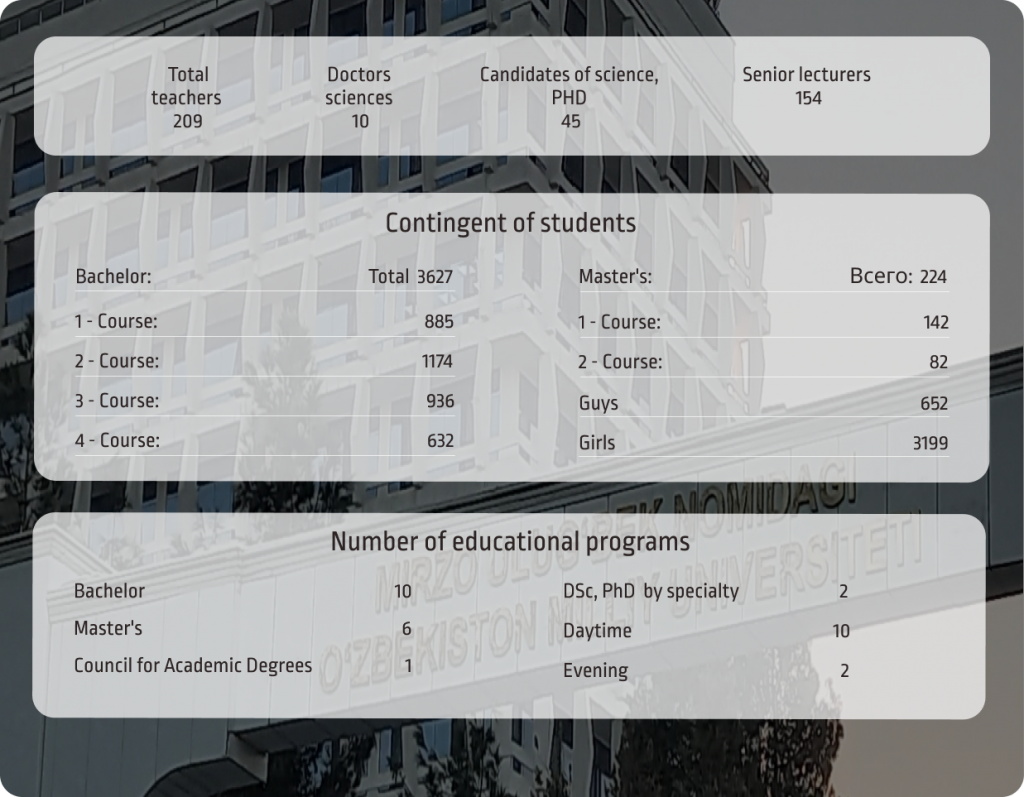 The main objective of the faculty today is to help students find their places in society in the future, and become independent, creative and competent professionals of the fields. Today, the attention of the faculty is aimed at making a significant contribution to the development of science in the country, the development of international cooperation, and the implementation of joint educational projects.
