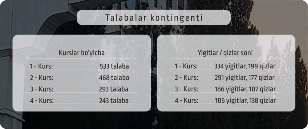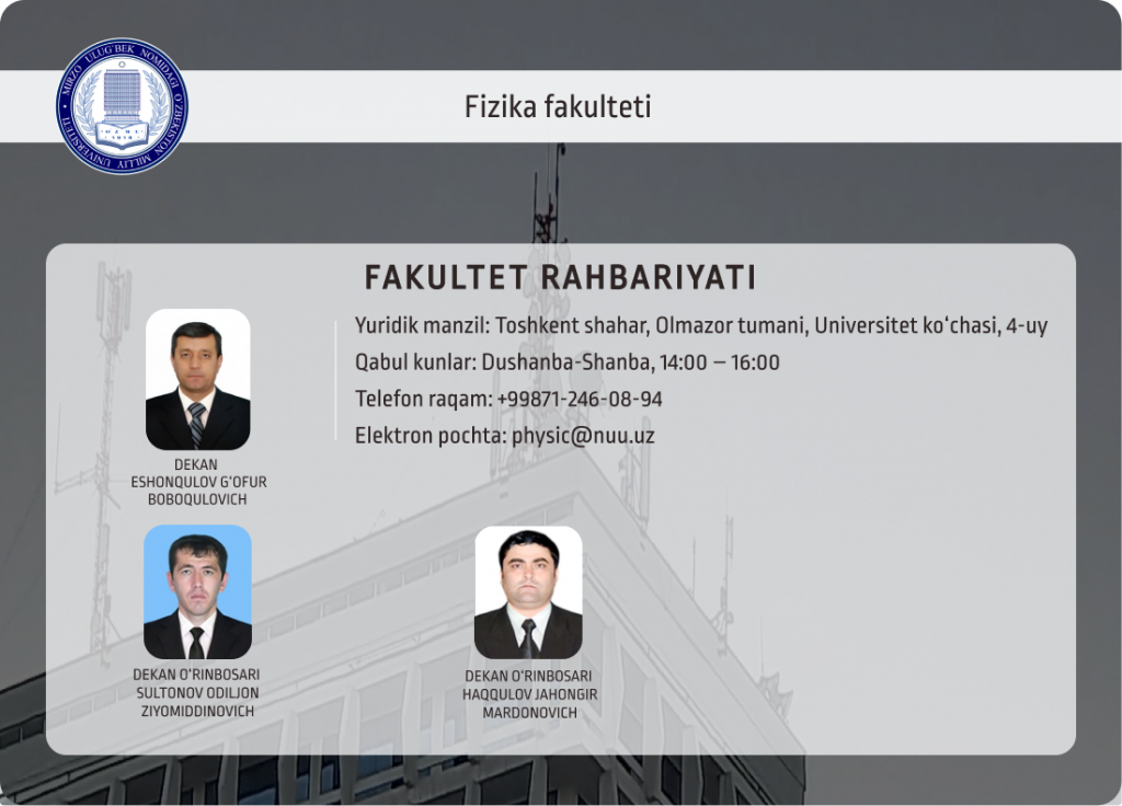Eshonqulov G’ofur Boboqulovich – Dean of the faculty 100174 Tashkent city, Almazor district, University street 4