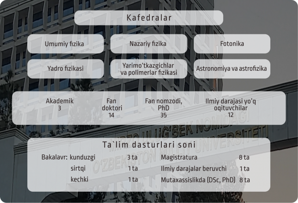 The Faculty of Physics prepares qualified bachelors and masters in Physics and Astronomy degree. Nowadays 4 member of Academy of Science Republic of Uzbekistan, 19 professors and more than 30 associate professors are involved inthe teaching process at the Faculty. Currently 425 bachelor students in 2 fields of study and 97 master students in 7 fields of study are educated on the Faculty. The Faculty of Physics also offers postgraduate and post doctorate training, where currently more than 15 postgraduate students and postdoctoraes are preparing their PhD and DSc research works.