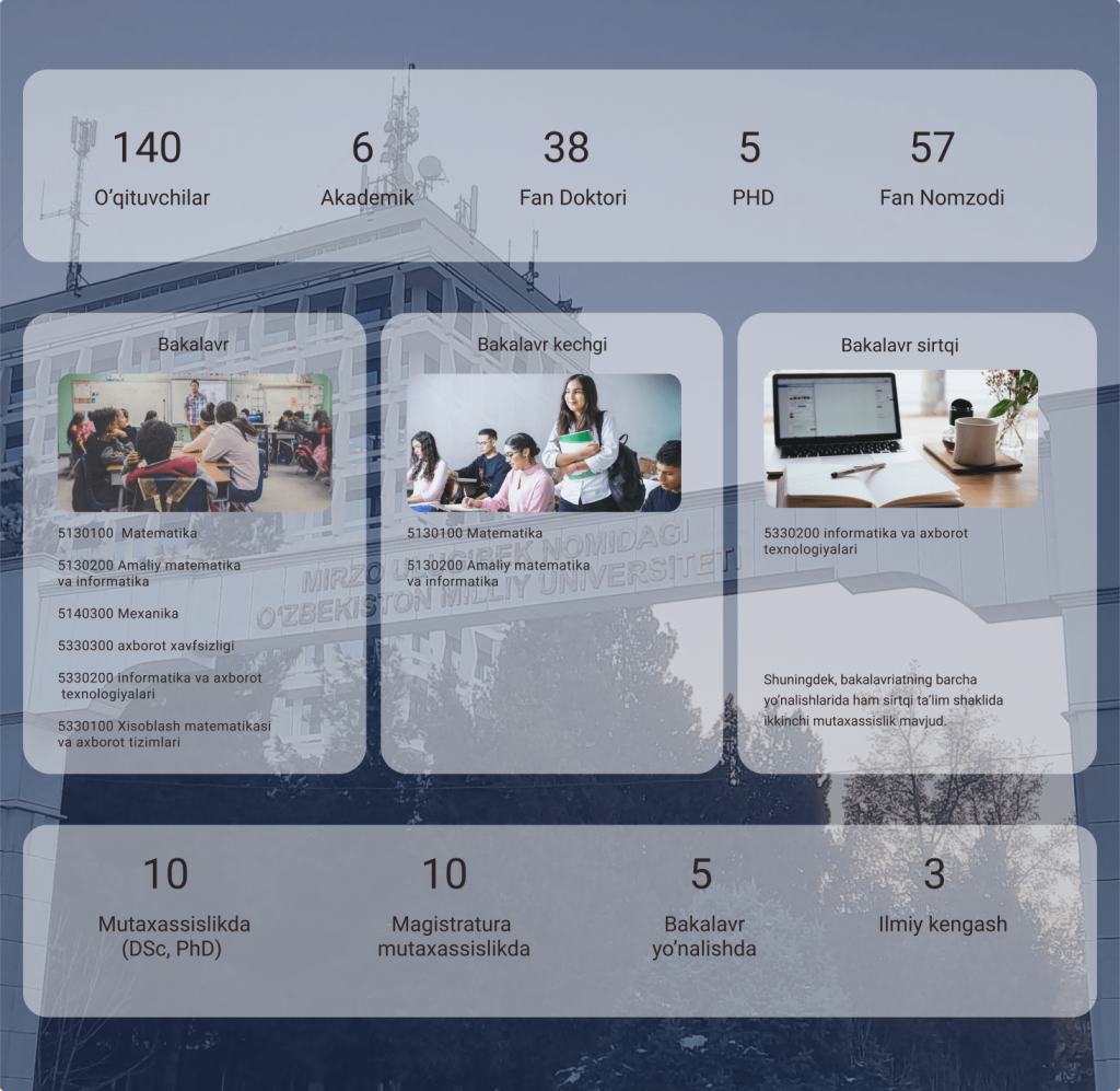 Математический факультет является одним из старейших факультетов Национального Университета Узбекистана, был создан как отдел в составе Народного университета Туркестана.