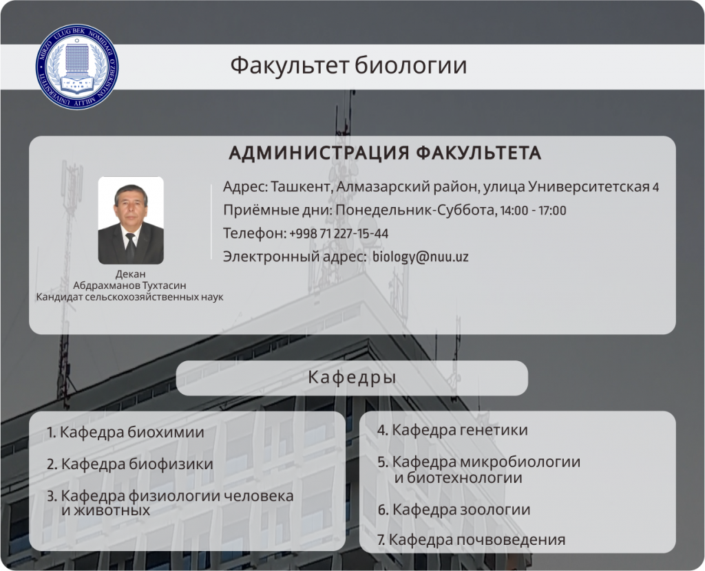 Биологический факультет Национального университета Узбекистана имени Мирзо Улугбека до 1930-х годов функционировал как отдел физико-математического факультета. В 1931 году был создан самостоятельный биолого-почвенный факультет. В 2015 году он был переименован в Биологический факультет. Такие ученые, как Ж.A. Мусаев (1928-2014), Ю. Туракулов (1917-2005), Т.З. Зохидов (1906-1981) и Б.О. Ташмухамедов (1935-2020) внесли большой вклад в деятельности факультета, в том числе в формировании научно-исследовательской работы.