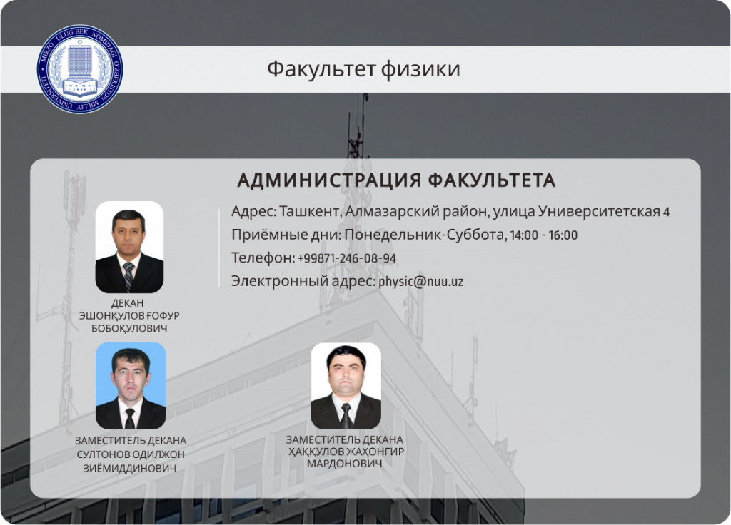 Хаккулов Джахонгир Мардонович — Зам. декана 100174 г.Ташкент, Алмазорский район, ул.Университетская, 4