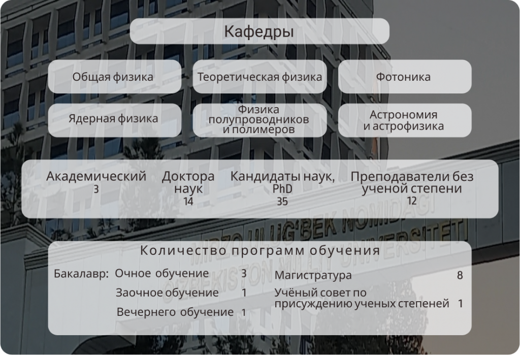 На этих кафедрах к учебному процессу привлечены 73 преподавателя, в том числе 4 академика АН РУз, 19 докторов наук и профессоров, 39 кандидатов наук. В данное время факультет готовит бакалавров по 2 направлениям обучения и магистров по 7 специальностям. Кроме этого, на факультете имеется докторантура по подготовке DSc и PhD. С целью проведения учебной и специализированной практики, подготовки магистерских диссертационных и выпускных квалификационных работ регулярно отправляются студенты в научные лаборатории, имеющие современные научно-технические базы. Среди них Институт ионно-плазменных и лазерных технологий АН РУз, Институт астрономии, Институт ядерной физики, Физико-технический институт научно-производственного объединения «Физика Солнца», Институт Физики и химии полимеров и другие институты Академии Наук, а также научно-производственные объединения «Фонон» и «Фотон». Информационно-ресурсный центр физического факультета оснащен литературным фондом в 100 000 книг и журналов, оборудован исходя из потребностей современного студента. Создан читальный зал на 80 мест, а также «Открытый фонд» журналов. Профессорско-преподавательским составом физического факультета изданы более 400 учебников и учебных пособий, около 50 новых учебных лабораторных работ, которые используются в учебном процессе. Подготовка и проведение научно — исследовательских работ на факультете проходит на высоком уровне. За последние 5 лет расширилось участие факультета в республиканских и международных грантах. Профессорско–преподавательским составом физического факультета выполняются более 10 международных и республиканских грантов, а также научные задачи и хоздоговора. Коллектив факультета ведет большую работу по подготовке высококвалифицированных кадров – физиков- преподавателей для вузов РУз, по повышению квалификации преподавателей, а также обеспечению их необходимой литературой. На сегодняшний день коллектив факультета плодотворно сотрудничает с университетами и институтами зарубежных стран. Ведутся совместные работы в учебно-методической и научно-исследовательской областях с учеными таких университетов и институтов, как Киевский Национальный Университет Украины, Харьковский университет, Харьковский физический институт, Российский университет Оптики и Механики в Санкт-Петербурге, Южно-Корейский Пусанский университет и Шанхайский Национальныйуниверситет Постдамский университет Германии, Белградская Астрономическая обсерватория и Институт Радиоастрономии, Московский Государственный университет, Объединенный ядерный исследовательский институт в г.Дубна Московской области, Университеты Майну, и Берна (Германии), Московский Энергетический институт, Физико-технический институт имени А.Ф. Иоффе (Санкт- Петербург), Институт материаловедения (Украина), Институт физики и химии (Урумчи, Китай). Вдальнешем необходимо отметить высокую потребность в специалистах, выпускаемых факультетом физики. Большинство из них дальнейшем работают в институтах АН РУз, диагностических центрах в области медицины, в организациях Министерства обороны, в центральных геологических лабораториях, в высших учебных заведениях, академических лицеях и профессионально-технических колледжах, а также предприятиях народного хозяйства.