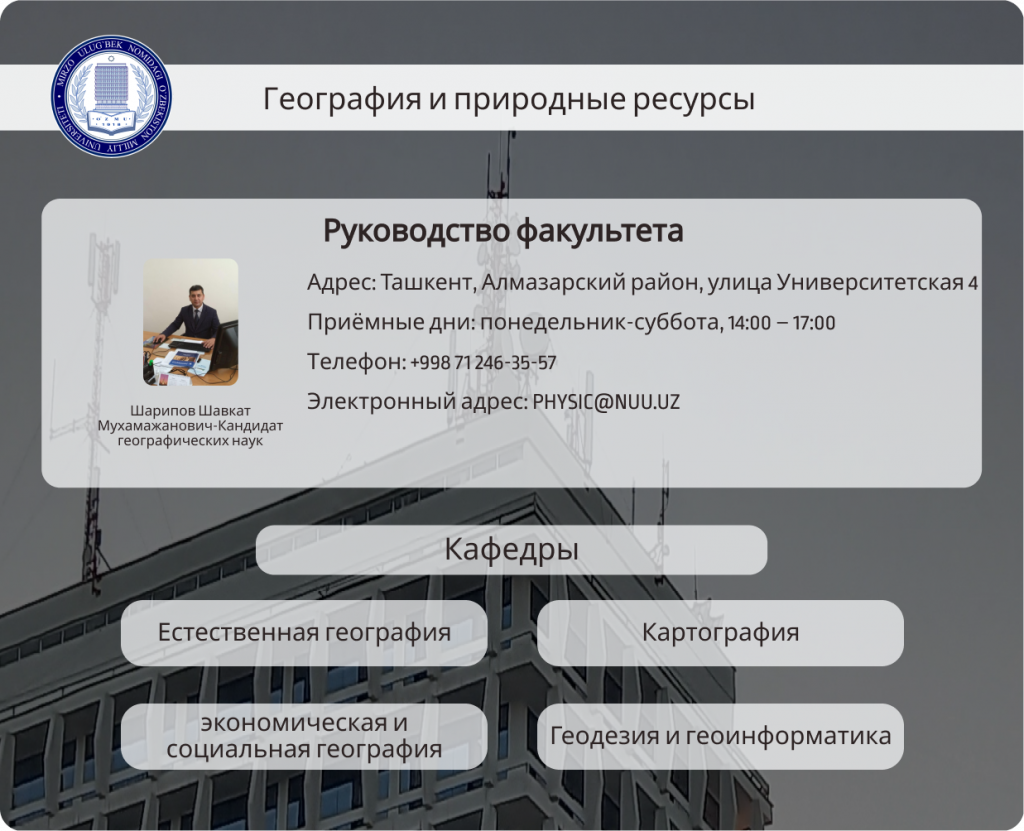 Подготовка специалистов бакалавров высокого класса в области физической и экономической географии, гидрологии, климатологии, картографии, геодезии для разных отраслей наук о земле, научно-исследовательских и производственных учреждений Узбекистана, высшей школы.