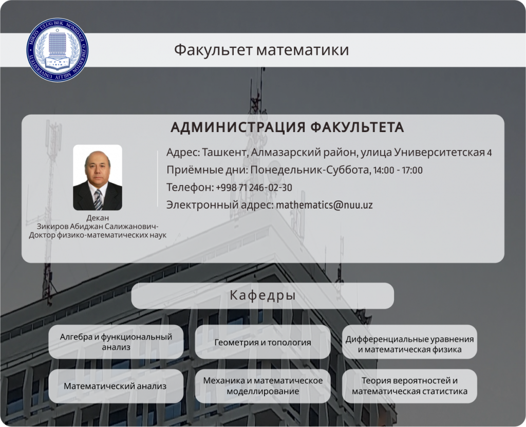 ЗикировОбиджан Салижанович – Декан факультета 100174 г.Ташкент, Алмазорский район, ул.Университетская, 4