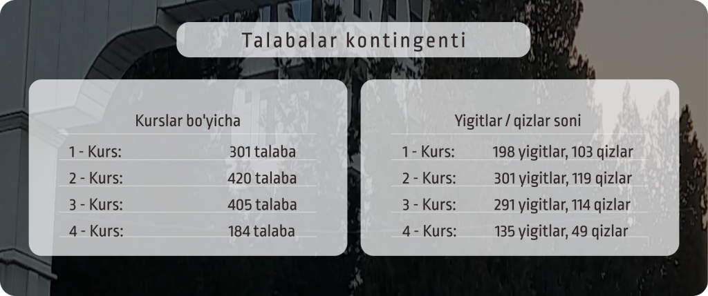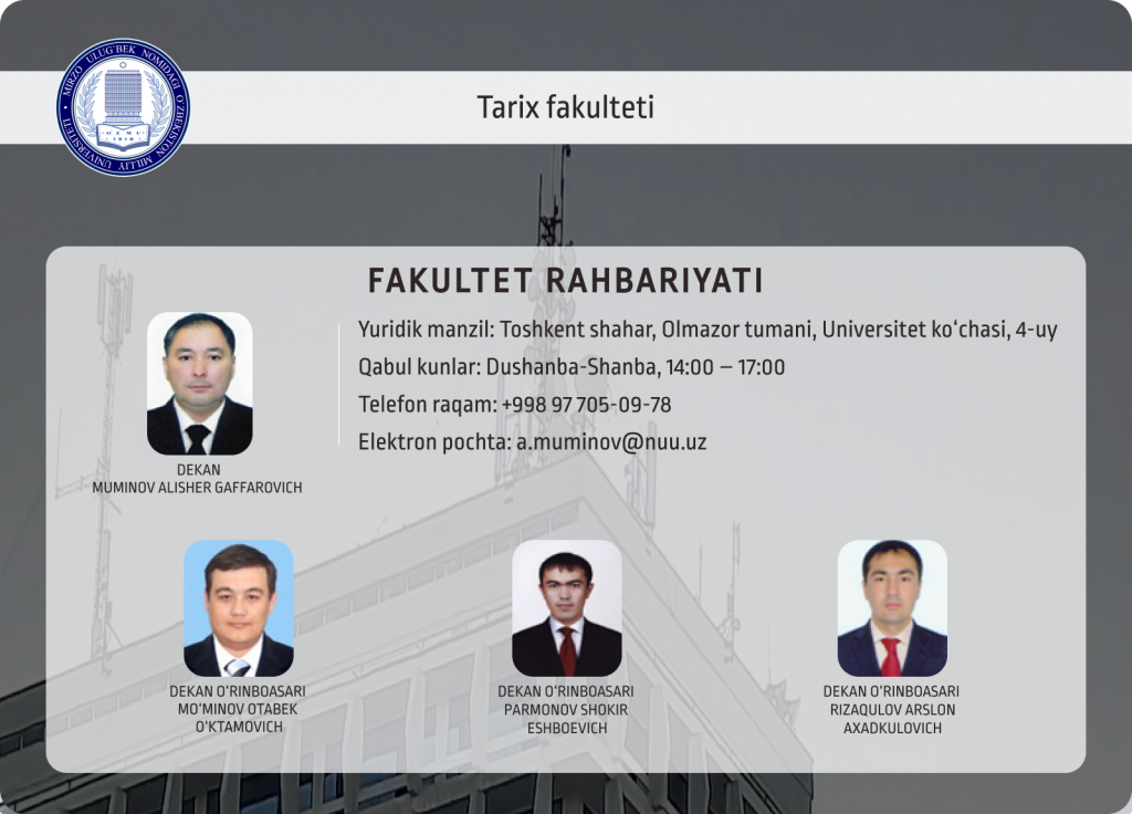 Djurayev Ravshan Xurramovich – Dekani o’rinbosari 100174 Toshkent shahar Olmazor tumani, Universitet ko’chasi 4-uy
