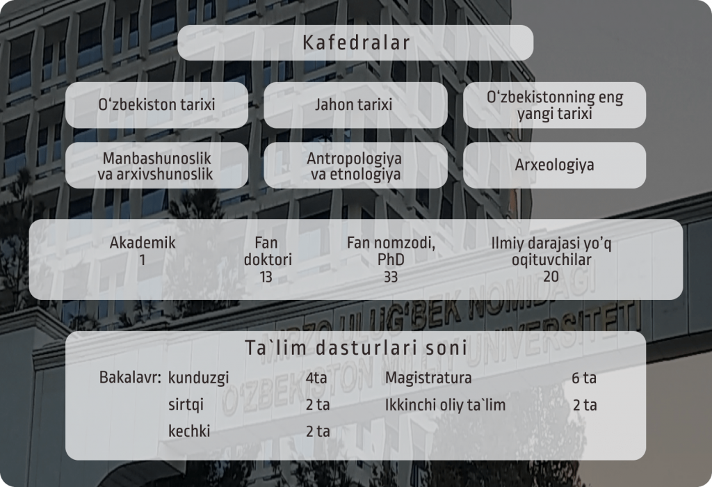 Tarix fakulteti 1935 yilda tashkil etilgan bo`lib, unda Qadimgi dunyo tarixi, O`rta asrlar tarixi va Yangi zamon tarixi kafedralari faoliyat olib borgan. Uning tarkibiga keyinchalik «Arxeologiya», «O`rta asrlar va yangi tarix»(keyinroq «Jahon tarixi»), Manbashunoslik, arxivshunoslik va muzeyshunoslik, Etnologiya kafedralari ham kirdi. Fakultet faoliyati davomida I.Dodonov, D.Lobashev, A.Hamraev, X.Hamroev, L.Gentshke, G.Kovalyov, O.Toshmuhammedov, G.A.Hidoyatov, A.S. Sagdullaev, X.G`. G`ulomov, Z.U. Choriev, A.S. Tatibaev Z.R.Ishonxo`jaeva, M.M.Haydarovlar tomonidan boshqarilgan. Hozirgi kunda fakultetga A.Muminov rahbarlik qilib kelmoqda.